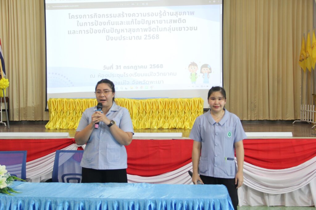 วันพฤหัสบดีที่ 31 กรกฎาคม 2568 นายภักดี ศรีโพธิ์ ผู้อำนวยการโรงเรียนแม่ใจวิทยาคม กล่าวเปิด โครงการกิจกรรมสร้างความรอบรู้ด้านสุขภาพ ในการป้องกันและแก้ไขปัญหายาเสพติดและการป้องกันปัญหาสุขภาพจิตในกลุ่มเยาวชน ให้แก่นักเรียนชั้นมัธยมศึกษาปีที่ 4 และ นักเรียนชั้นมัธยมศึกษาปีที่ 6 โรงเรียนแม่ใจวิทยาคม โดย สาธารณสุขอำเภอแม่ใจ จ.พะเยา