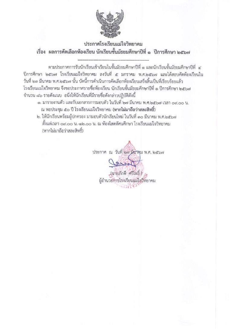 ประกาศ/ประชาสัมพันธ์ ประกาศ!!! ผลการคัดเลือกห้องเรียน นักเรียนชั้นมัธยมศึกษาปีที่ 1 ปีการศึกษา 256726/03/202426/03/2024
